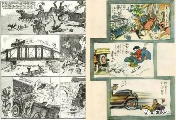 日本著名漫画家北泽乐天(多数人可能没听说过,但要说《铁臂阿童木》的作者手冢治虫也受到了北泽乐天的影响,那就明白此人的地位了)曾在20世纪初画过一系列关于汽车的漫画,主要通过汽车(当时非常有钱的人才买得起车)体现了权贵与平民的关系。虽然在这部讽刺漫画中汽车并不是主角,也并未涉及赛车领域,但依然可以看做是日本汽车漫画的鼻祖。